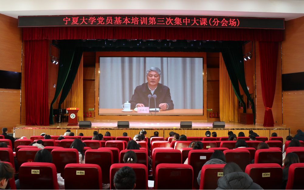 为进一步强化全院师生党员理论水平和党性修养,切实提高党员队伍素质能力,按照宁夏大学党委统一安排,12月3日,我院组织党员在中卫校区报告厅参加党员基本培训第三次集中大课,学习中央党校(国家行政学院)副校长(副院长)谢春涛讲授的“中国共产党与中华民族伟大复兴”视频课程。