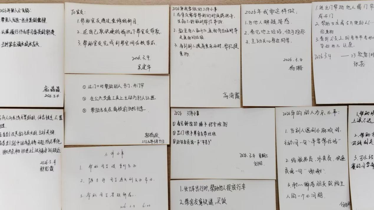 在深入学习雷锋精神后,每位党员手持“初心”卡片,写下2026年可践行的助人为乐小事,并交换卡片、交流分享,将各自的年度行动小目标分享给同学。一张张小卡片,不仅是践行雷锋精神的具体承诺,更承载着大学生党员向善而行的满满善意与坚定决心。雷锋精神从不是一阵风,而是需要日复一日践行的初心。大学生党员要以此次活动为起点,牢记初心、践行使命,把卡片上的承诺落到实处,把身边的小事做好,用点滴善意汇聚暖流,以实际行动争做新时代“活雷锋”。