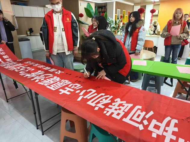 与此同时,大家追溯着革命先烈的奋斗历程,回首了峥嵘岁月中的热血与担当,从历史的回望中汲取奋进的力量,让红色基因、革命薪火得以代代传承。为进一步坚定学雷锋、践初心的信念,全体志愿者与社区居民一同参与主题横幅签名活动。大家郑重地写下自己的名字,一笔一划都彰显着传承雷锋精神的决心、承载着对服务社会的承诺。横幅上密密麻麻的签名,汇聚成传承雷锋精神的青春洪流。